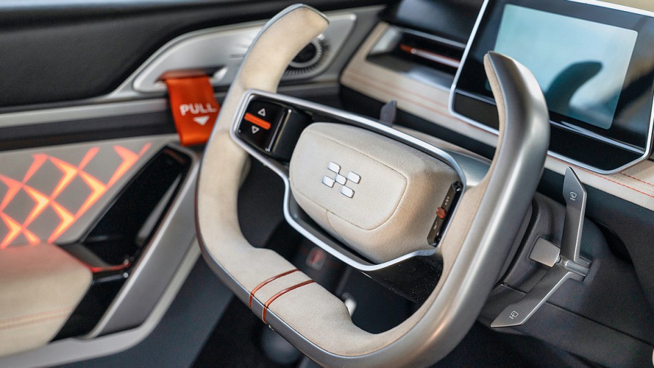 von 5: Im Innenraum der Studie fällt ein rechteckiges Multifunktions-Sportlenkrad auf; es ist nach oben offen und erinnert an die Steuerung eines Flugzeugs.