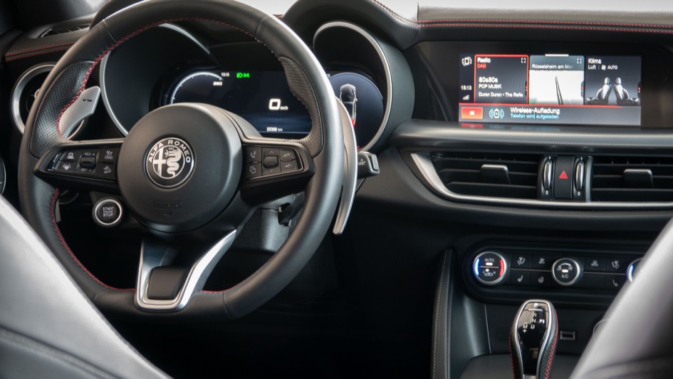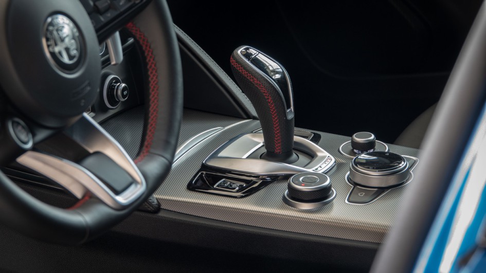 von 17: Da weiß man im Alfa Romeo Stelvio noch wo man hin greift. Der Gangwahlhebel erklärt sich von alleine und ist blind bedienbar, einige Tasten drum herum helfen, das Auto nach eigenem Gusto zu verändern.