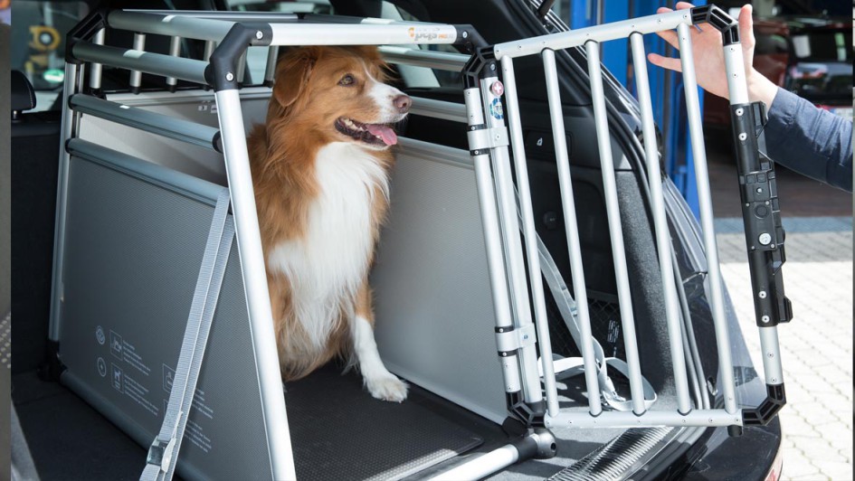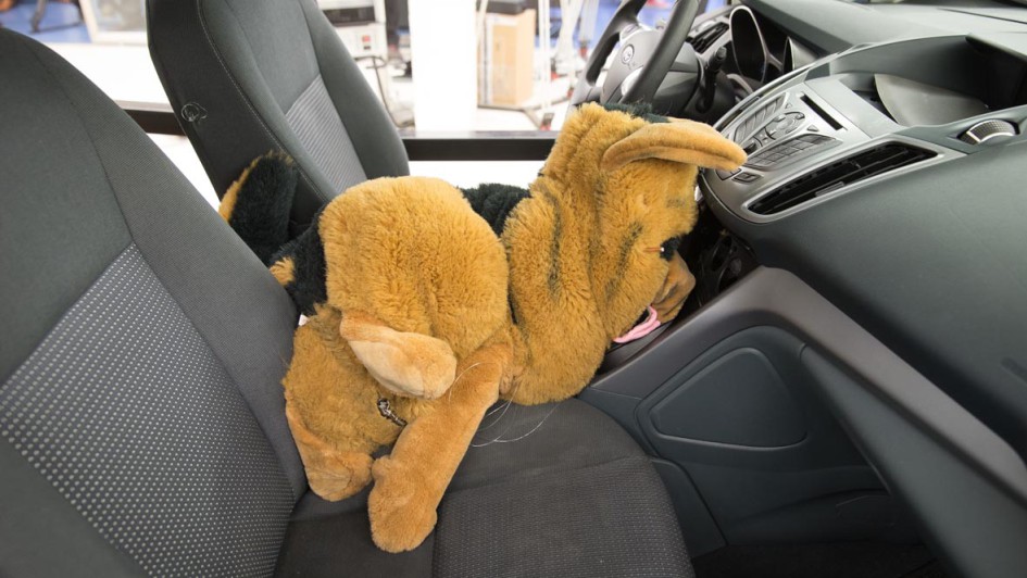von 3: Bei einem Aufprall mit 40 Kilometern pro Stunde wurde deutlich, wie gefährlich es für Hund und Insassen werden kann, wenn das Tier ohne geeignete Sicherungsmaßnahmen im Auto mitfährt.