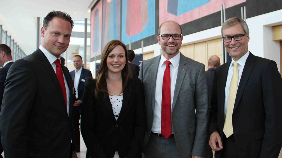 von 18: Daniela Peter (Mercedes-Benz) mit den Santander-Managern Jascha Bräuer (l.) und Sönke Roggenbuck. Rechts Hyundai-Vertriebschef Udo Brandenburger