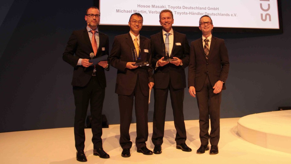 von 18: Die zufriedensten Händler unter den großen Importmarken hat Toyota: Hosoe Masaki (Toyota Deutschland GmbH) mit Michael Martin (Toyota-Händlerverband)