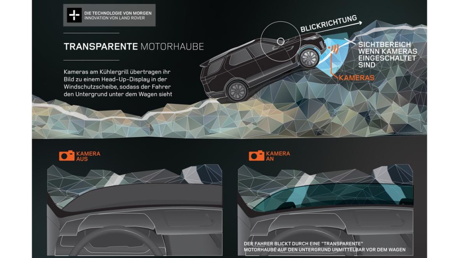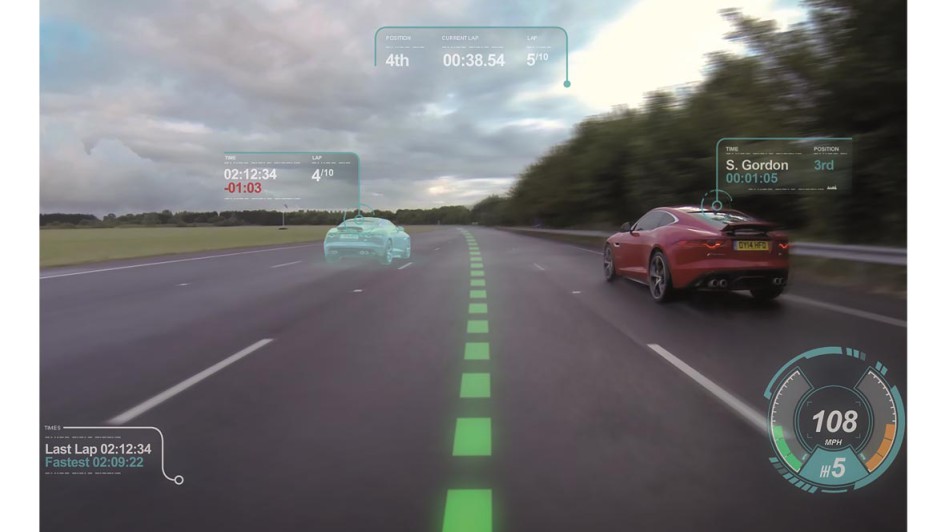 von 5: Auf der Windschutzscheibe wird virtuell auf einer Rennstrecke ein Computer-Gegner erzeugt (links) und die Ideallinie auf die Fahrbahn projiziert, auf der der Pilot ihn überholen kann