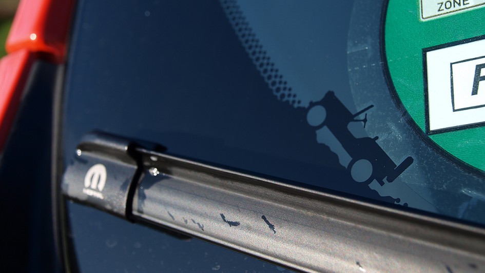 von 6: Die Entwickler des Mini-SUV Jeep Renegade haben ebenfalls an liebevollem Kitsch nicht gespart: Da wäre zum Beispiel der stilisierte Militärjeep Willys, der in der schwarzen Umrandung der Frontscheibe fährt.