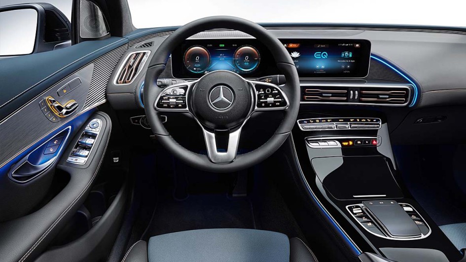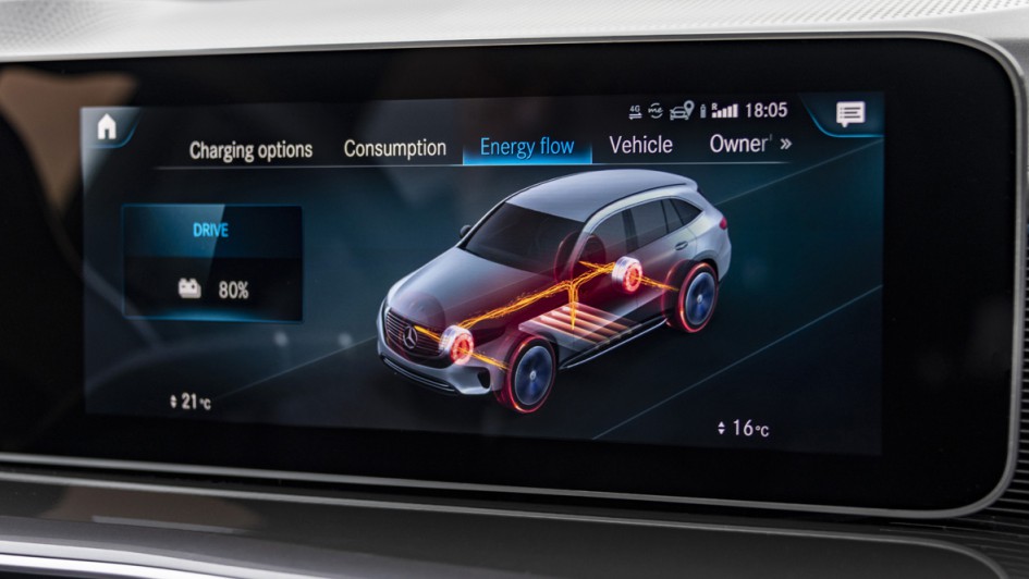 von 14: Obwohl der Breitwand-Monitor in ähnlicher Art schon in der A-Klasse Dienst tut, zeigt er im EQC in besonderer Form die gewünschte Wirkung des Neuartigen.