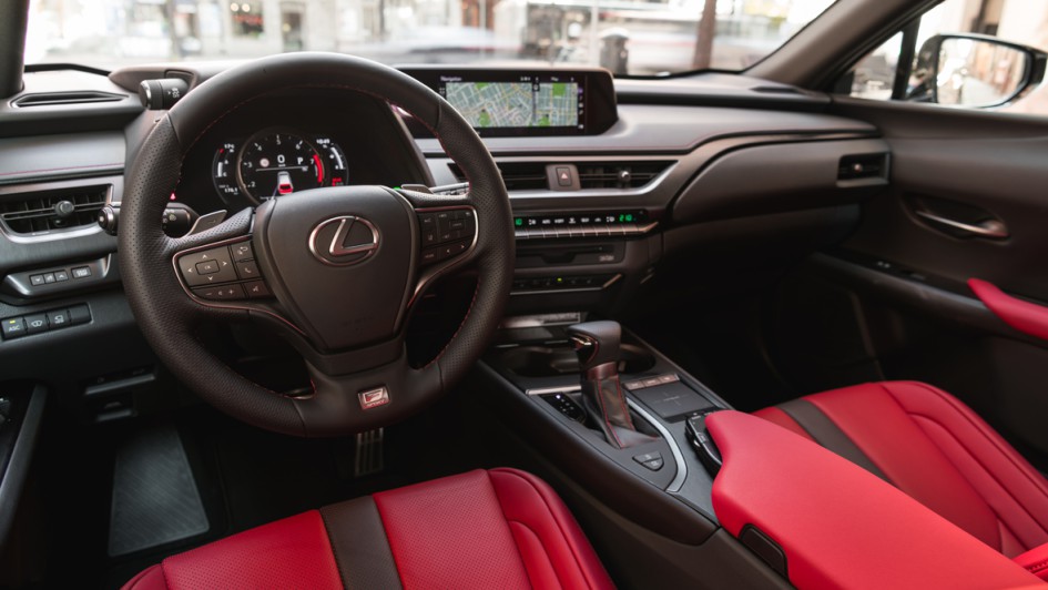 von 5: Innen hat Lexus souverän gediegene Materialien verarbeitet. Mit 10,2-Zoll-Display sind die Japaner auf der Höhe der Zeit, das Touchpad auf der Mittelkonsole zur Bedienung arbeitet zumindest bei moderatem Fahrtempo genau und gibt mit leichten Vibrationen Rückmeldung.
