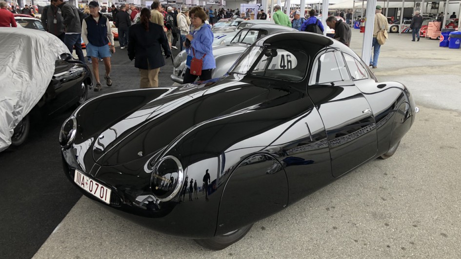 von 10: Der von Ferdinand Porsche entwickelte, pechschwarze Typ 64 ist einer von drei je gebauten Prototypen. Zwei hintereinander montierte Sitze im schmalen Abteil für die Insassen.