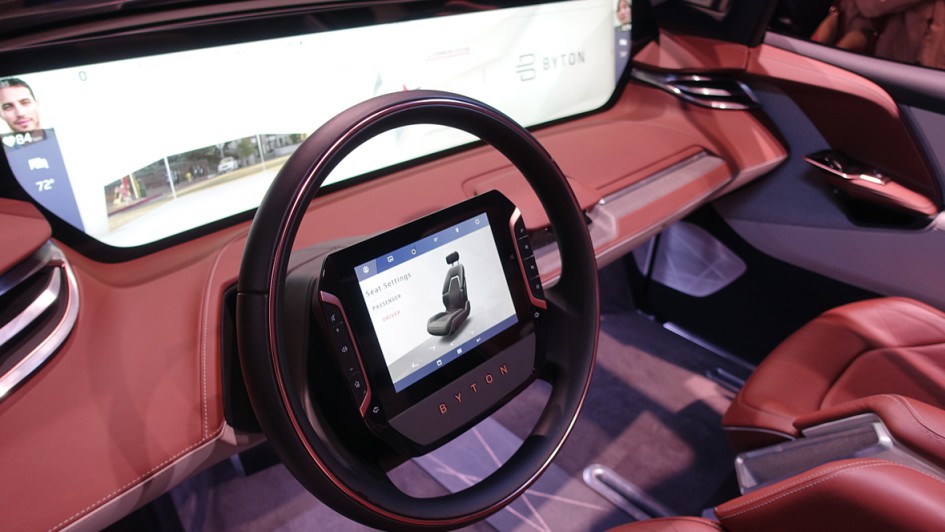 von 7: Autohersteller Byton zeigt ein 48 Zoll breites Display (124x24 Zentimeter). Es wird im demnächst erscheinenden SUV M-Byte in Serie an Bord sein.