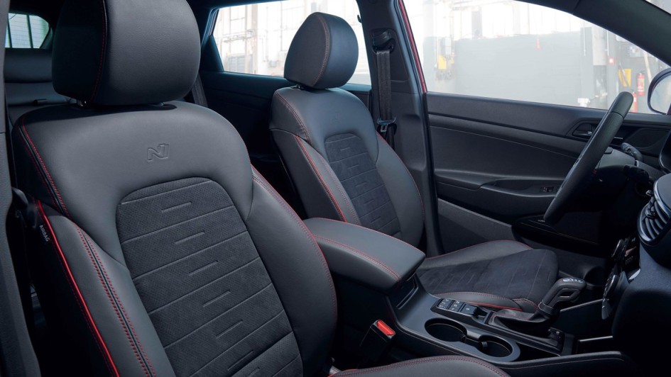 von 10: Am auffälligsten sind aber die roten Ziernähte an den schwarzen Leder-Stoff-Sitzen. Letztere sind allerdings genauso weich gepolstert wie das Standard-Gestühl. Das N-Line-Modell fährt serienmäßig mit Edelstahl-Pedalerie vor, ansonsten aber bleibt es bei der übersichtlichen, unaufgeregten Inneneinrichtung des Standard-Tucsons.