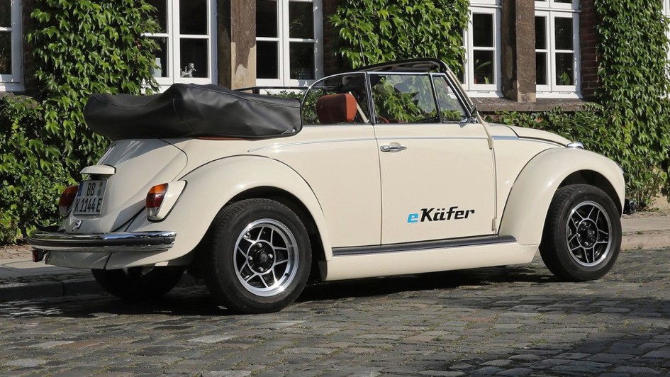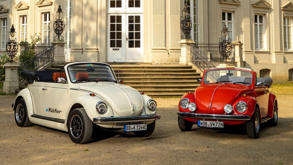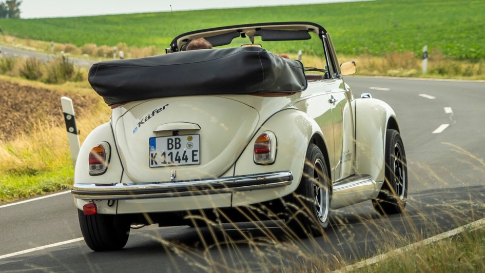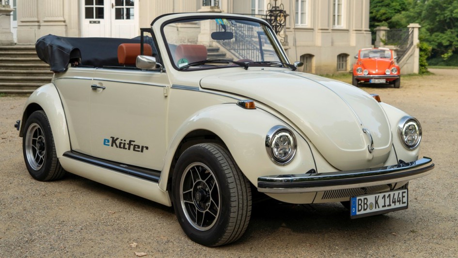 von 9: Nur wenige Details unterscheiden den E-Käfer vom Original (r.). Auffällig sind die weit nach unten gezogenen Seitenschweller, denn der Akku ist im Fahrzeugboden untergebracht.