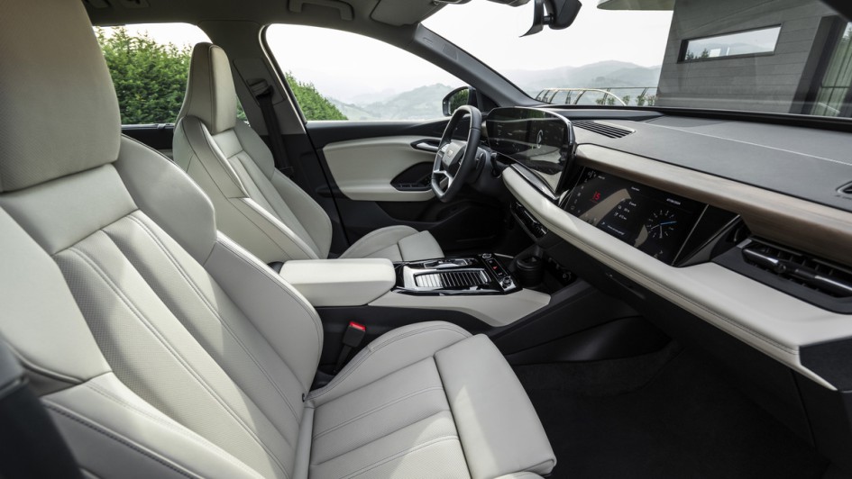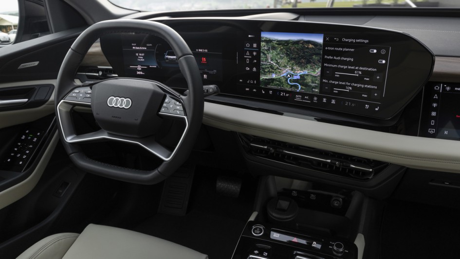 von 11: Neues gibt es am Armaturenbrett. Gewölbtes Display und auf Wunsch ein zweites für den Beifahrer. Akustikverglasung kostet im Audi Q6 e-tron 150 Euro extra, dunkle Scheiben hinten gibt es für 440 Euro.