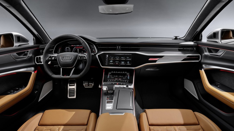 von 14: Das Cockpit des RS 6 bietet die Black-Panel-Optik der drei Bildschirme sowie eine perfekte Verarbeitung. Weitere Highlights: ein abgeflachtes und vollperforiertes Lederlenkrad, Kontrastnähte sowie Einlagen in Karbon, Aluminium oder Holz.