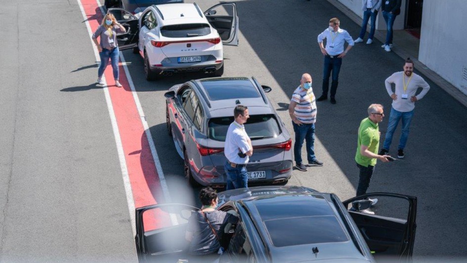 von 29: Dass elektrifizierte Autos auch mal auf den Track können, bewiesen die Cupra Leon e-Hybride. Nach jedem Fahrerwechsel wurden die Fahrzeuge desinfiziert. Zeit zum Luftholen und Austauschen.