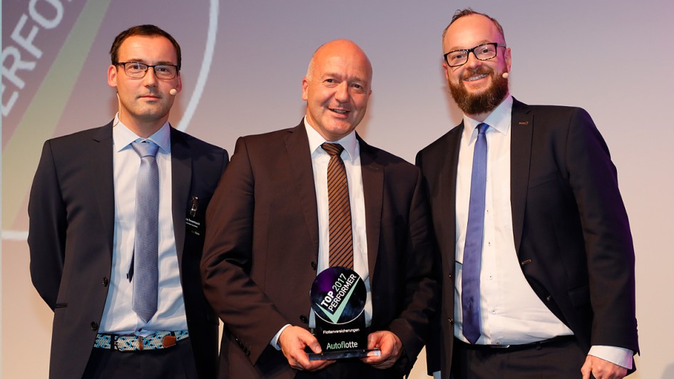 von 40: V.l.n.r.: Christian F. Merten (Chefredakteur Autoflotte), Harald Mondt, Leiter Vertrieb Leasinggesellschaften und Autovermieter bei PSA in Deutschland, und Rocco Swantusch (Autoflotte) - "Autoflotte TopPerformer 2017" in der Kategorie "Große Transporter" (für Peugeot Expert/Traveller)