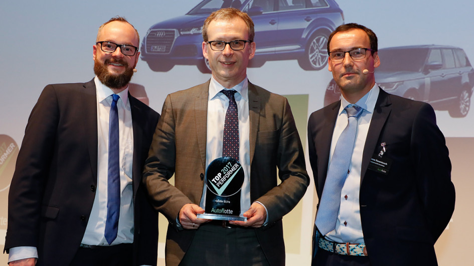 von 40: V.l.n.r.: Christian F. Merten (Chefredakteur Autoflotte), Ralf Weichselbaum, Leiter Verkauf an Großkunden Handelsgeschäft Audi, und Rocco Swantusch (Autoflotte) - "Autoflotte TopPerformer 2017" in der Kategorie "Großes SUVs" (für Q7) und mit dem Q2 zweiter Platz in der Kategorie "Neueinsteiger"