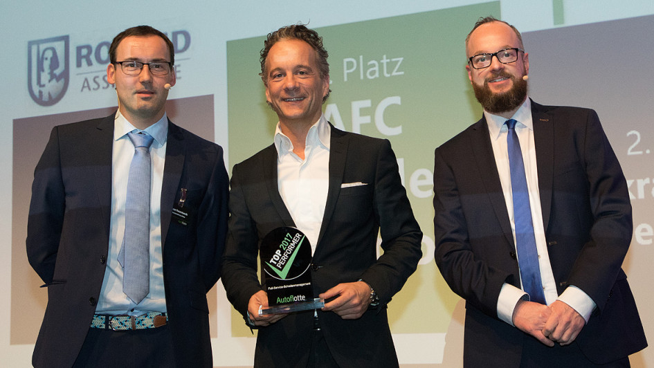 von 40: V.l.n.r.: Rocco Swantusch (Autoflotte), Michael Pfister, Geschäftsführer AFC Auto Fleet Control, und Christan F. Merten (Chefredakteur Autoflotte) - "Autoflotte TopPerformer 2017" in der Kategorie "Full-Service-Schadenmanagement"