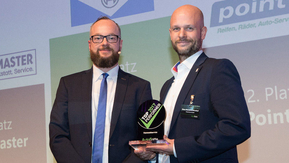 von 40: V.l.n.r.: Christan F. Merten (Chefredakteur Autoflotte) und Dan-Hendrik Bronkal, Automotive Aftermarket, Sales Marketing Services Channels Central Europe bei Bosch - "Autoflotte TopPerformer 2017" in der Kategorie "Werkstattservice"