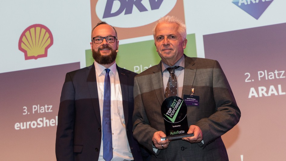 von 40: V.l.n.r.: Christan F. Merten (Chefredakteur Autoflotte) und Ulrich Wolter, Director Marketing bei DKV Euro Service - "Autoflotte TopPerformer 2017" in der Kategorie "Tankkarten"
