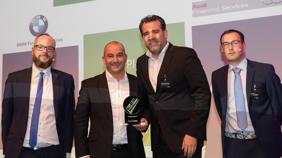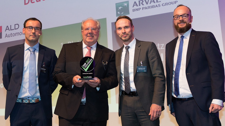 von 40: V.l.n.r.: Rocco Swantusch (Autoflotte), Harald Frings (Geschäftsführer Deutsche Leasing Fleet), Christian Pursch (Deutsche Leasing Fleet) und Christan F. Merten (Chefredakteur Autoflotte) - "Autoflotte TopPerformer 2017" in der Kategorie "Leasing (Non-Captive)"