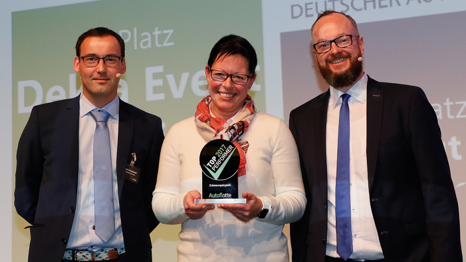 von 40: V.l.n.r.: Rocco Swantusch (Autoflotte), Andrea Brunner, Leiterin Event und Logistics bei Dekra Event & Logistic Services, und Christan F. Merten (Chefredakteur Autoflotte) - "Autoflotte TopPerformer 2017" in der Kategorie "Zulassungslogistik"