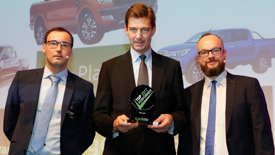von 40: V.l.n.r.: Rocco Swantusch (Autoflotte), Carsten Salchow, Leiter Geschäftsentwicklung & Verkaufsprogramme Fleet bei Ford und Christian F. Merten (Chefredakteur Autoflotte) - "Autoflotte TopPerformer 2017" in der Kategorie "Pick-ups" (für Ranger)