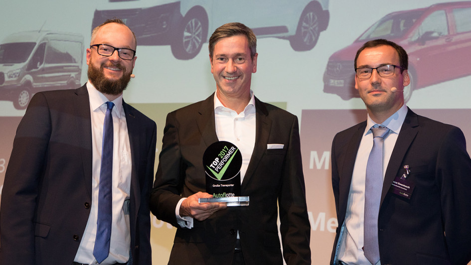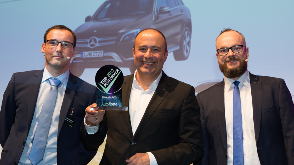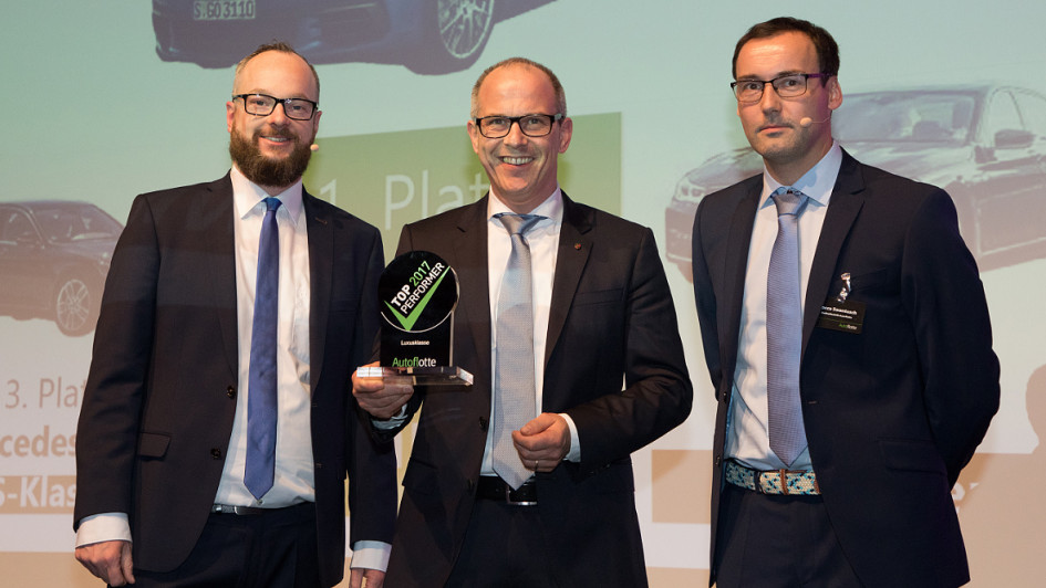 von 40: V.l.n.r.: Rocco Swantusch (Autoflotte), Frank Kemmerer, Leiter Flottenmanagement Pkw Mercedes-Benz Vertrieb Deutschland, und Christian F. Merten (Chefredakteur Autoflotte)- "Autoflotte TopPerformer 2017" in den Kategorien "Obere Mittelklasse", "Mittelgroße SUVs" und "Hersteller" (für E-Klasse, GLC und der Marke Mercedes-Benz)
