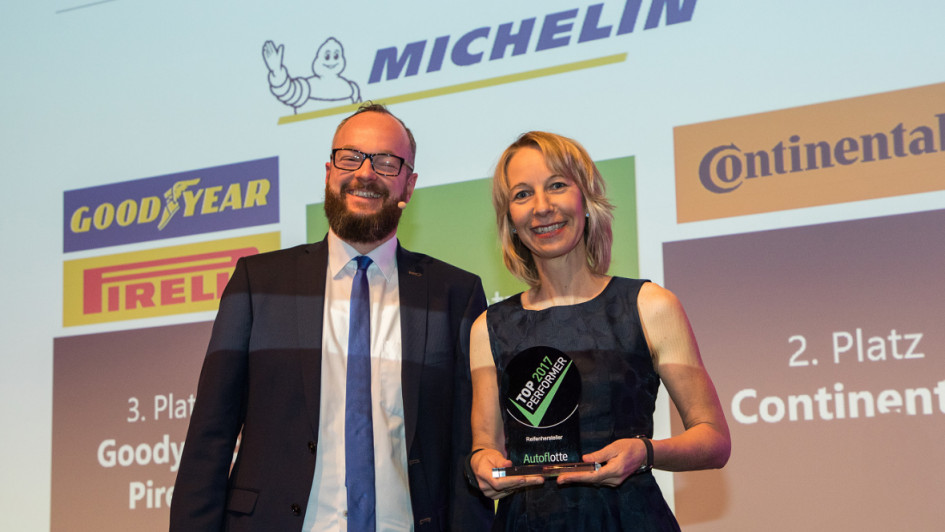 von 40: V.l.n.r.: Christan F. Merten (Chefredakteur Autoflotte) und Simone Loosemann, Leiterin Marketing Nutzfahrzeuge Michelin Deutschland, Österreich, Schweiz - "Autoflotte TopPerformer 2017" in der Kategorie "Reifenhersteller"