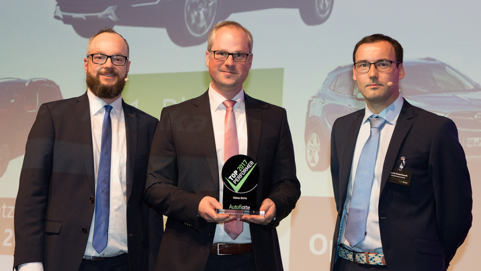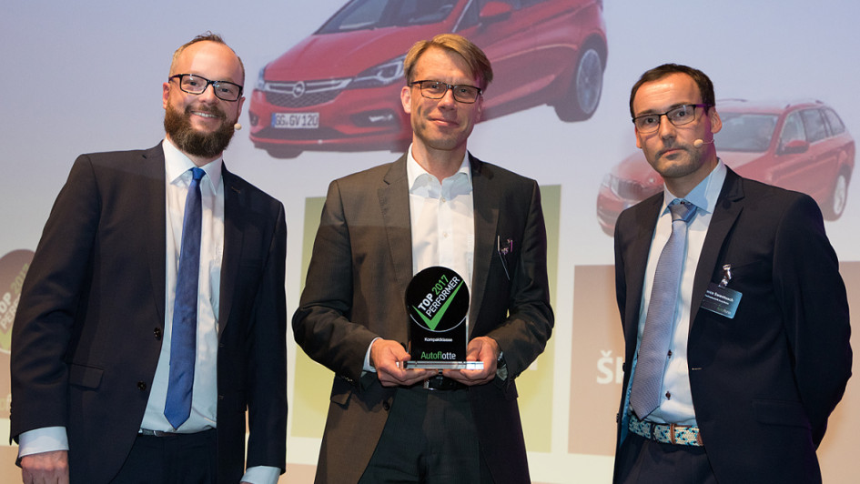 von 40: V.l.n.r.: Christian F. Merten (Chefredakteur Autoflotte), Frank Hägele, Direktor Verkauf Groß- und Gewerbekunden bei Opel, und Rocco Swantusch (Autoflotte) - "Autoflotte TopPerformer 2017" in der Kategorie "Kompaktklasse" (für Astra)