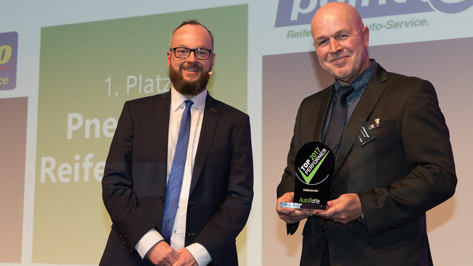 von 40: V.l.n.r.: Christan F. Merten (Chefredakteur Autoflotte) und Bernd Weishaupt, Großkundenbetreuer bei Pneuhage Reigendienste - "Autoflotte TopPerformer 2017" in der Kategorie "Reifenservice"