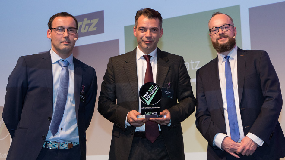 von 40: V.l.n.r.: Rocco Swantusch, Vinzenz Pflanz (Chief Sales Officer Sixt Leasing) und Christan F. Merten (Chefredakteur Autoflotte) - "Autoflotte TopPerformer 2017" in der Kategorie "Autovermietung/Langzeitmiete" für die Sixt Autovermietung