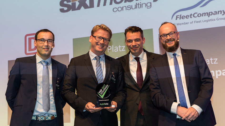 von 40: V.l.n.r.: Rocco Swantusch (Autoflotte), Thomas Emmert, Vinzenz Pflanz (beide Geschäftsführer bei Sixt Mobility Consulting) und Christan F. Merten (Chefredakteur Autoflotte) - "Autoflotte TopPerformer 2017" in der Kategorie "Fuhrparkmanagement"