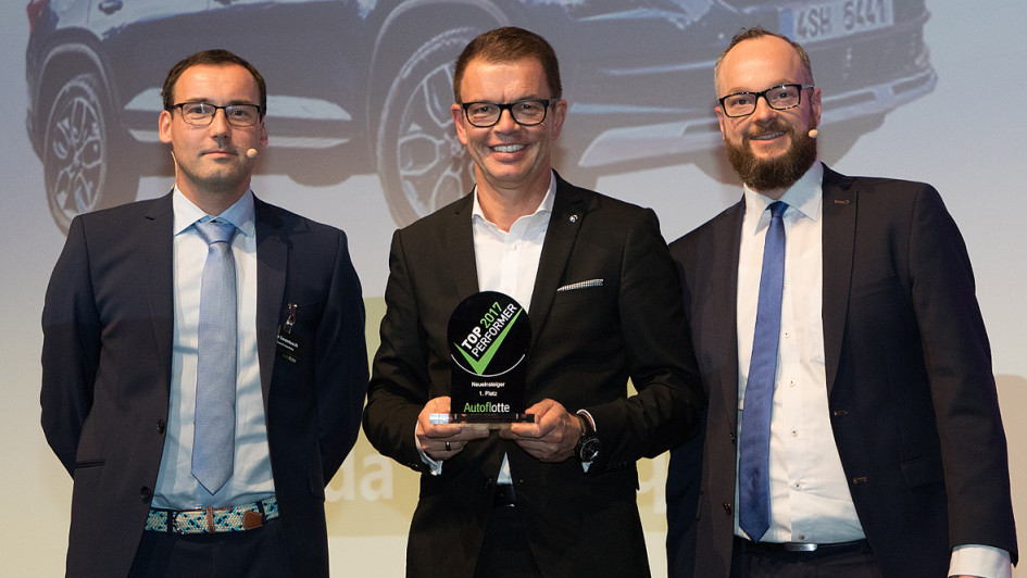 von 40: V.l.n.r.: Rocco Swantusch (Autoflotte), Stefan N. Quary, Leiter Vertrieb bei Skoda Auto Deutschlandm und Christian F. Merten (Chefredakteur Autoflotte) - "Autoflotte TopPerformer 2017" in den Kategorien "Mittelklasse" und "Importeure" (für Superb und der Marke Skoda) sowie für den ersten Platz der Kategorie "Neueinsteiger" (Kodiaq)