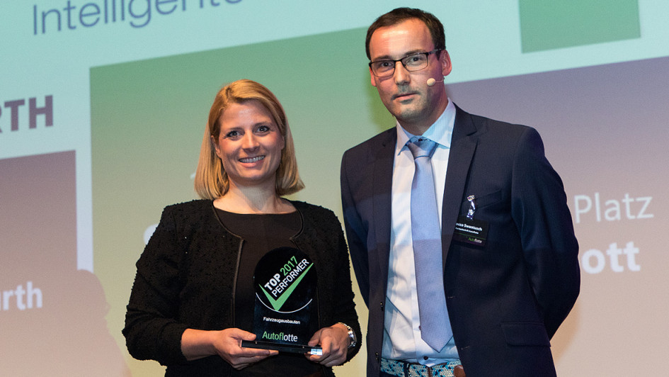 von 40: V.l.n.r.: Jana Heiß, Teamleiterin Corporate Communication bei Sortimo International, und Rocco Swantusch - "Autoflotte TopPerformer 2017" in der Kategorie "Fahrzeugausbauten"