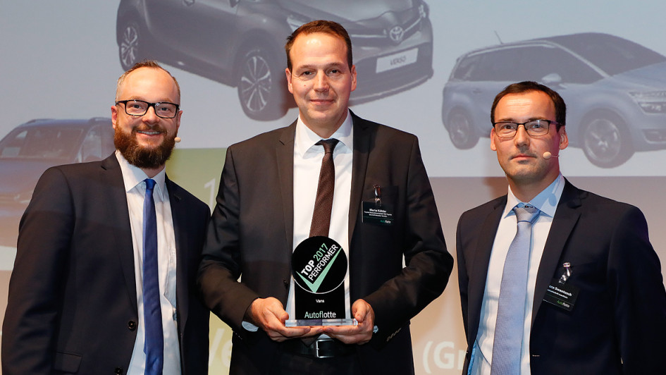 von 40: V.l.n.r.: Christian F. Merten (Chefredakteur Autoflotte), Mario Köhler, Leiter Toyota Geschäftskunden Service und Rocco Swantusch (Autoflotte) - "Autoflotte TopPerformer 2017" in den Kategorien "City Cars" und "Vans" (für Aygo und Verso)