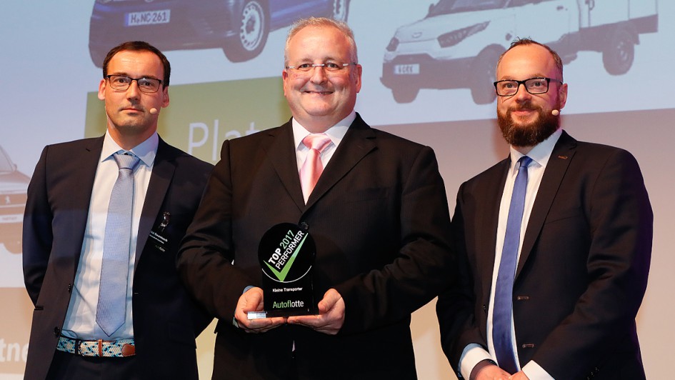 von 40: V.l.n.r.: Rocco Swantusch (Autoflotte), Klaus Feike, Leiter Vertrieb Groß- und Gewerbekunden bei Volkswagen Nutzfahrzeuge, und Christian F. Merten - "Autoflotte TopPerformer 2017" in der Kategorie "Kleine Transporter" (für Caddy)