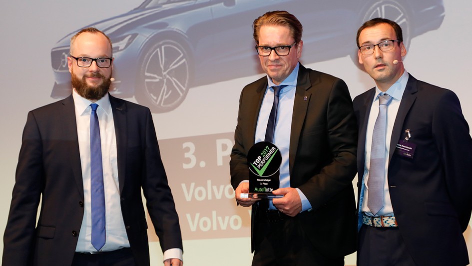 von 40: V.l.n.r.: Christian F. Merten (Chefredakteur Autoflotte), Axel Zurhausen, Leiter Vertrieb Großkunden bei Volvo Car Germany, und Rocco Swantusch (Autoflotte) – dritter Platz in der Kategorie "Neueinsteiger" (für Volvo S90/V90)