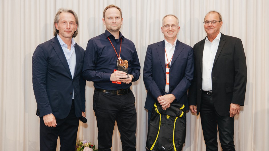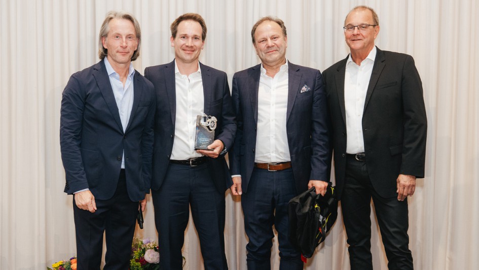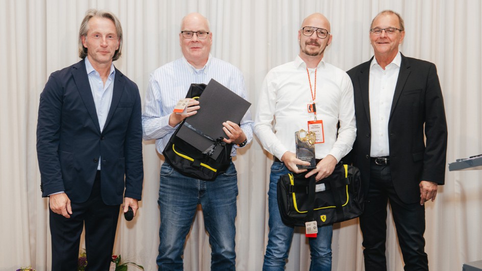 von 12: Thomas Hanswillemenke, Vorstand Mobility, Santander Deutschland (li.) und AUTOHAUS-Chefredakteur Ralph M. Meunzel (re.) mit den stolzen Siegern Kai Wicke und Thomas Froitzheim.