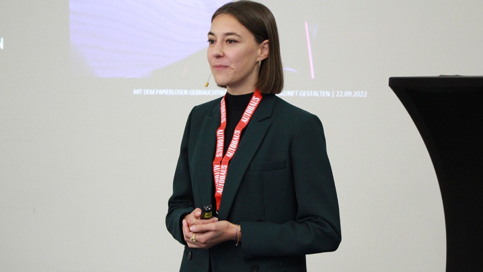 von 13: Fiona Eidenmüller, Geschäftsleitung Auto-Scholz Gruppe, referierte über das Thema: "Mit dem papierlosen Gebrauchtwagenvertrieb die Zukunft gestalten."
