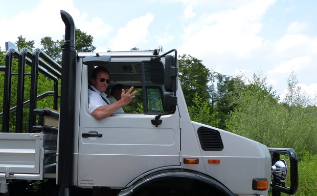 von 6: Großer Unimog-Fan: Arnold Schwarzenegger drehte im Sommer 2012 eine Proberunde in dem flexiblen Fahrzeug. Der Hollywood-Star überraschte damals das Unimog-Museum Gaggenau mit einem Spontanbesuch.