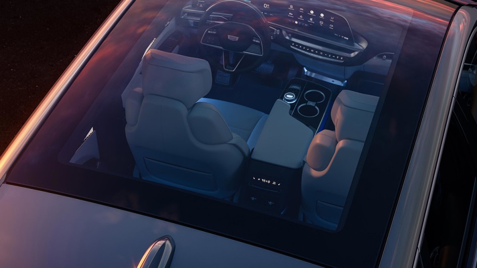 von 9: Das Raumgefühl im Lyriq ist außergewöhnlich, einmal bedingt durch den für Elektroautos charakteristischen Flachboden ohne Mitteltunnel, zum anderen durch das riesige Panoramadach.