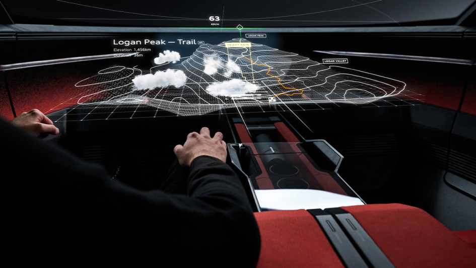 von 6: Beispiel Audi Active Sphere: Außer dem Knopf für den Warnblinker, einem kleinen Drehschalter für die Fahrtrichtung und einem kleinen Display ist das Cockpit völlig leer. Selbst Lenkrad und Pedale verschwinden, wenn das Offroad-Coupé autonom unterwegs ist.