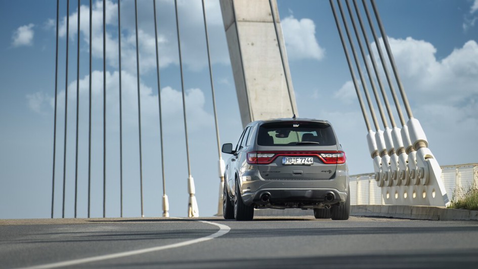von 14: Mit den schwarz lackierten 20-Zoll-Rädern markiert Hellcat das untere Ende der Fahrzeug- und Leistungsklasse. Mit einem CW-Wert von 0,35 "pfeilt" der Durango durch den Fahrtwind, bis Tempo 290. Da jedoch bietet nicht der Wind dem Durango pari, sondern die Elektronik. Schneller könnte er, darf es aber nicht.