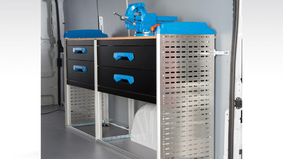 von 4: Der Einrichtungsblock auf der rechten Laderaumseite verfügt neben weiteren praktischen Schubladen über eine Arbeitsplatte mit Parallelschraubstock inklusive Drehteller.