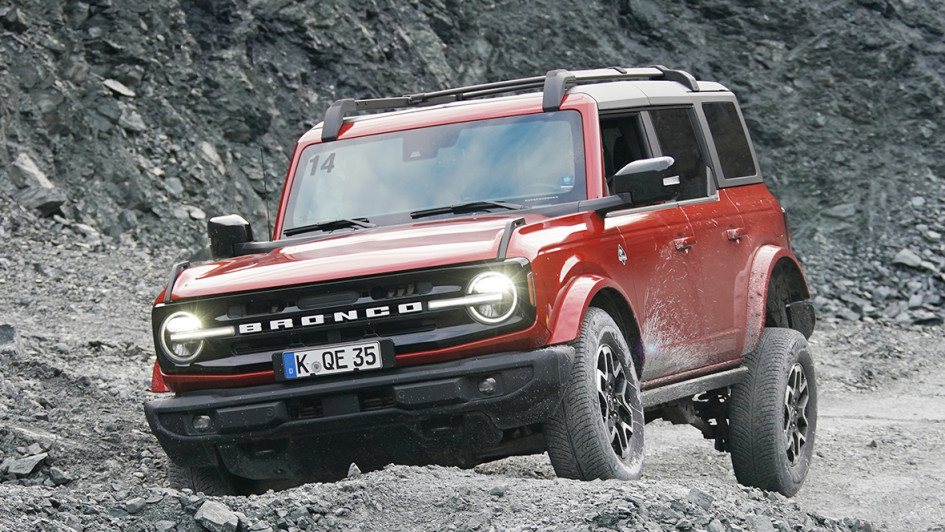 von 7: Deutsche Bronco-Kunden bekommen die erste Charge als geräumigen Viertürer (4,81 Meter Länge), angetrieben von einem bärenstarken, Pardon: brauererigaulstarken V6-Biturbo-Benziner mit reichlich 560 Newtonmeter Drehmoment und 335 PS Leistung.