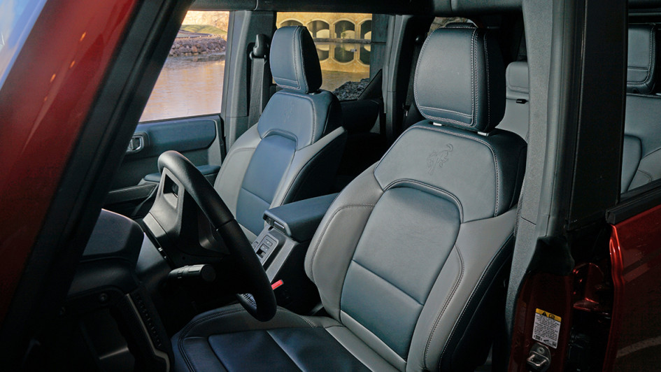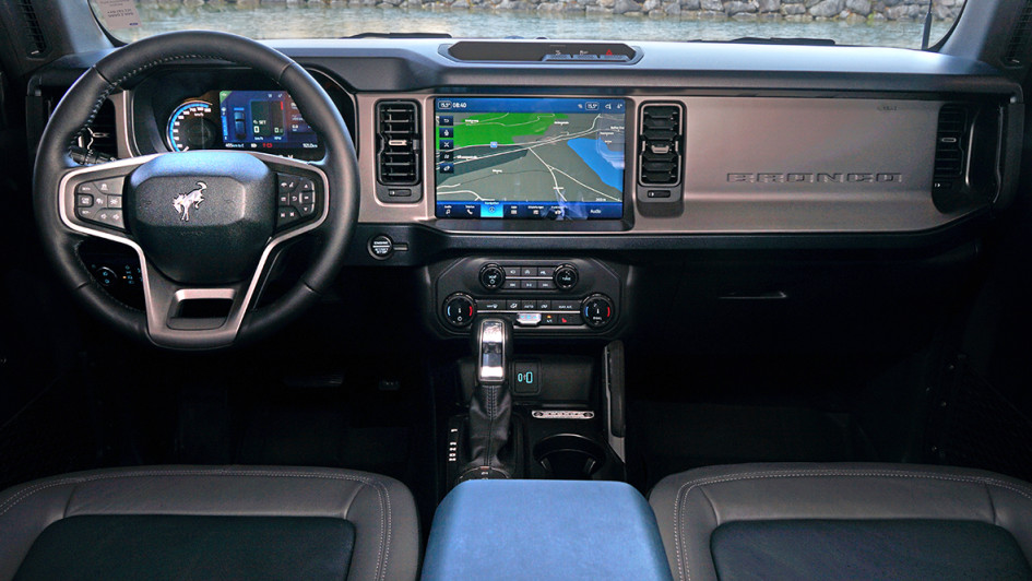 von 7: Angekommen ist man im Bronco schnell. Denn in der Kommandozentrale sitzt es sich gut. Der 12-Zoll-Touchscreen beeindruckt und zeigt allerlei hilfreiche und überflüssige Informationen an.