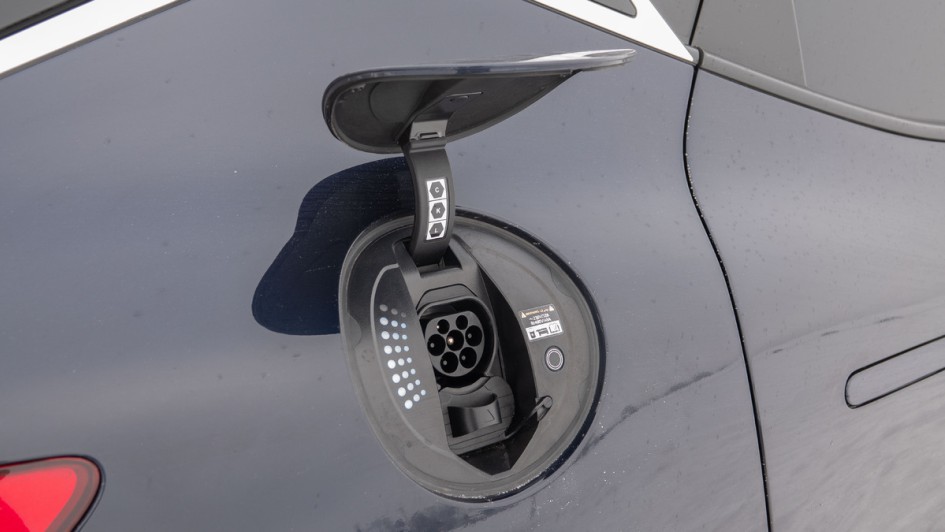 von 23: Geladen wird hinten rechts. Die Klappe öffnet auf Berührung und schließt mittels Knöpfchen oder wenn man sie zudrückt. 11 kW an der Wallbox, 240 kW in der Spitze am High Performance Charger (HPC).