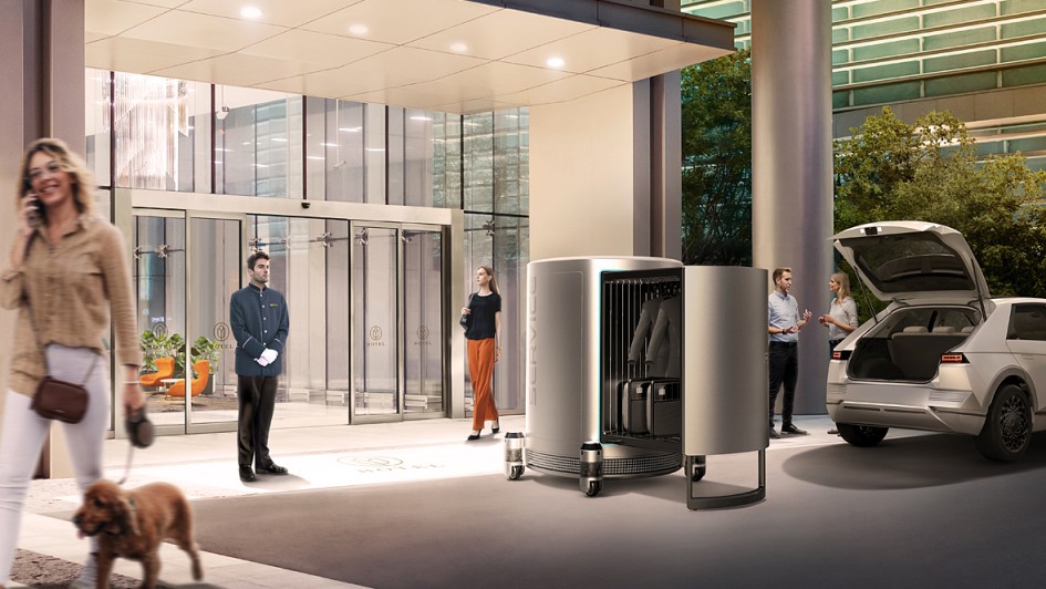 von 7: Die rollenden Kisten sollen künftig nicht nur Menschen befördern. Eine etwas kleine Version der Roboter übernimmt Transportaufgaben, wie zum Beispiel vor einem Hotel die Beförderung des Reisegepäcks vom Taxi ins gebuchte Zimmer.
