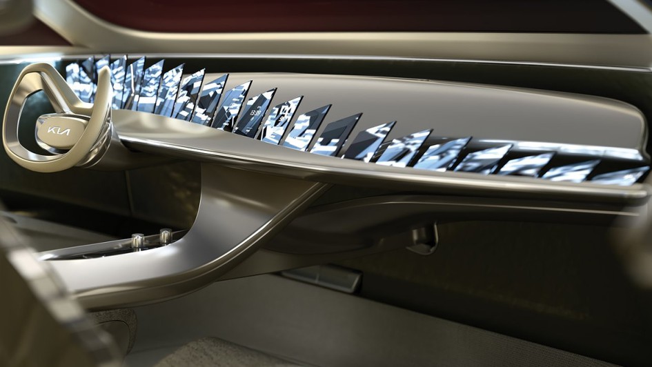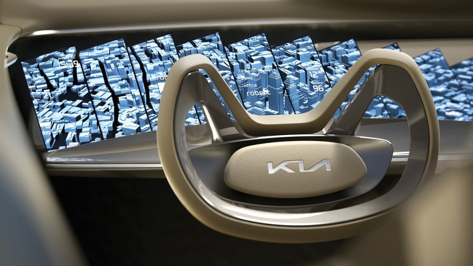 von 8: Besonders auffällig ist die Gestaltung der Front. Kia verzichtet auf einen Kühlergrill, stattdessen wird die Studie von einem über die ganze Fahrzeugbreite gehenden Leuchtband geprägt.