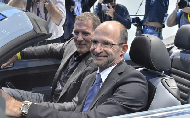 Mit prominenter Besetzung: VW-Design-Chef Klaus Bischoff sitzt am Steuer des Beetle Cabrio, neben ihm lächelt der auch als VW-Markenbotschafter tätige Schauspieler und Bodybuilder Ralf Möller (Gladiator) in die Kamera.