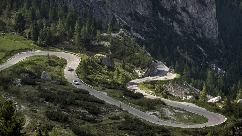 von 7: Und wieder hoch: Immer und immer wieder prügelt Ingenieur Karl Richards seinen gescheckten Prototypen die drei Dutzend Kehren zum Passo Pordoi hinauf.