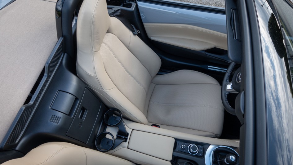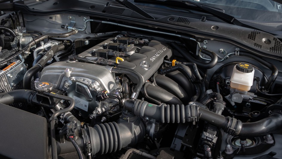 von 17: Der 1,5-Liter-Sauger im Mazda MX-5 kommt ohne Elektrifizierung und ohne Turbo aus. Im Drehzahlkeller tut sich nicht so viel, obenraus genug. 132 PS werden mobilisiert und bringen den ohne Fahrer knapp mehr als 1.000 Kilogramm wiegenden Zwerg forsch voran.